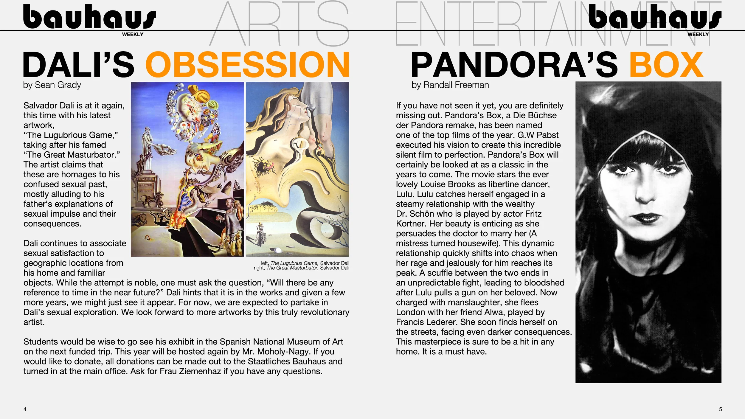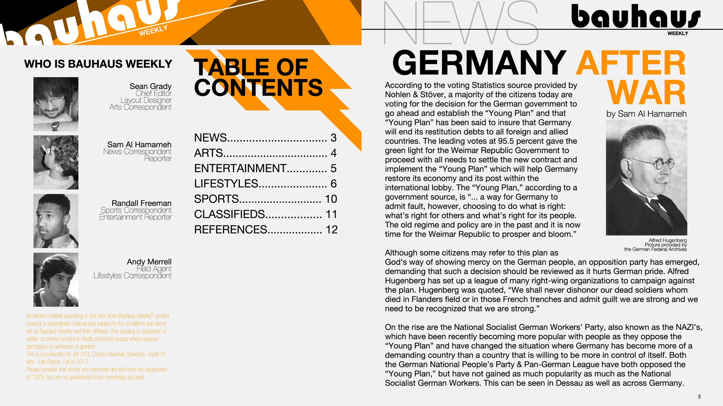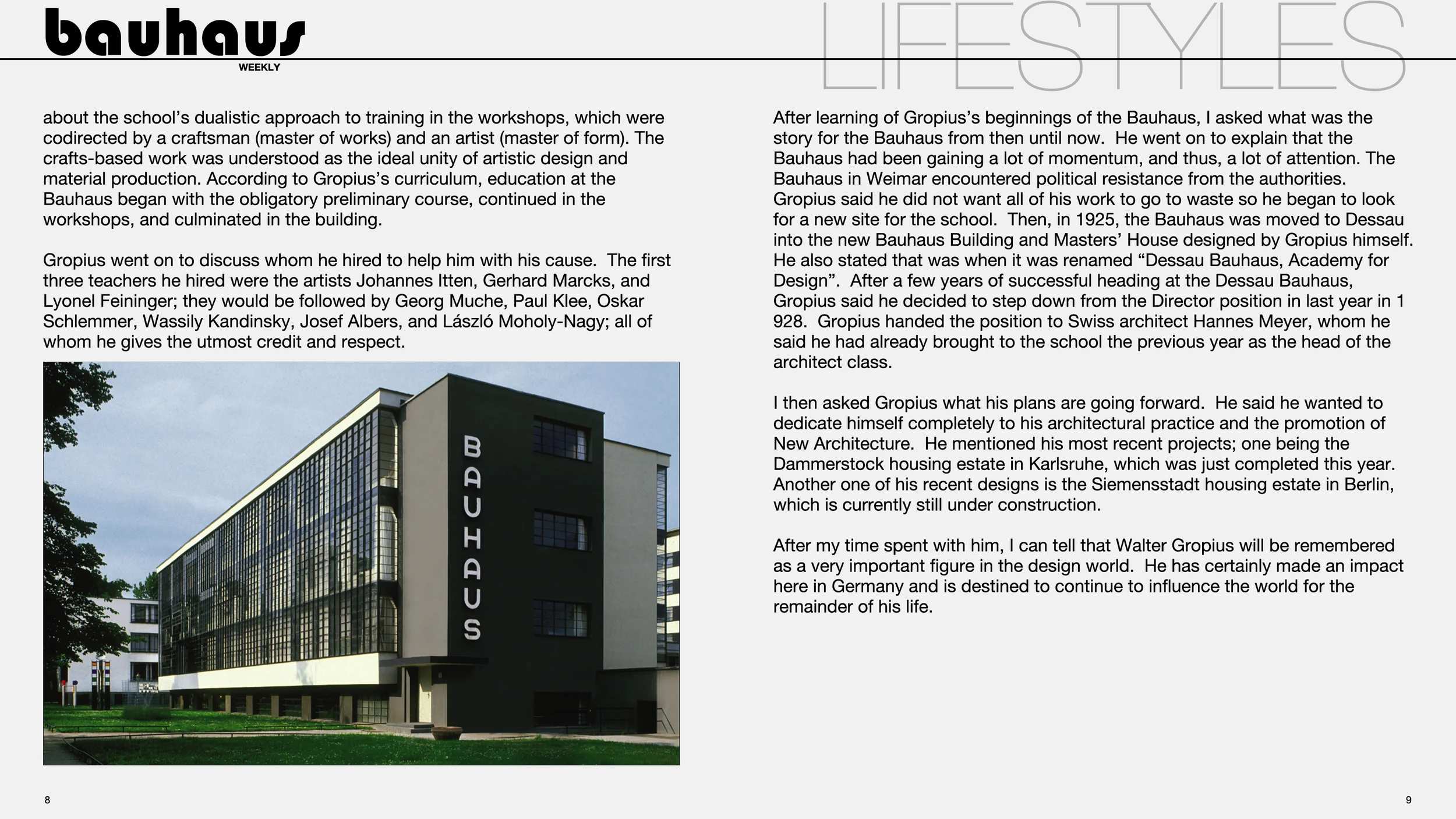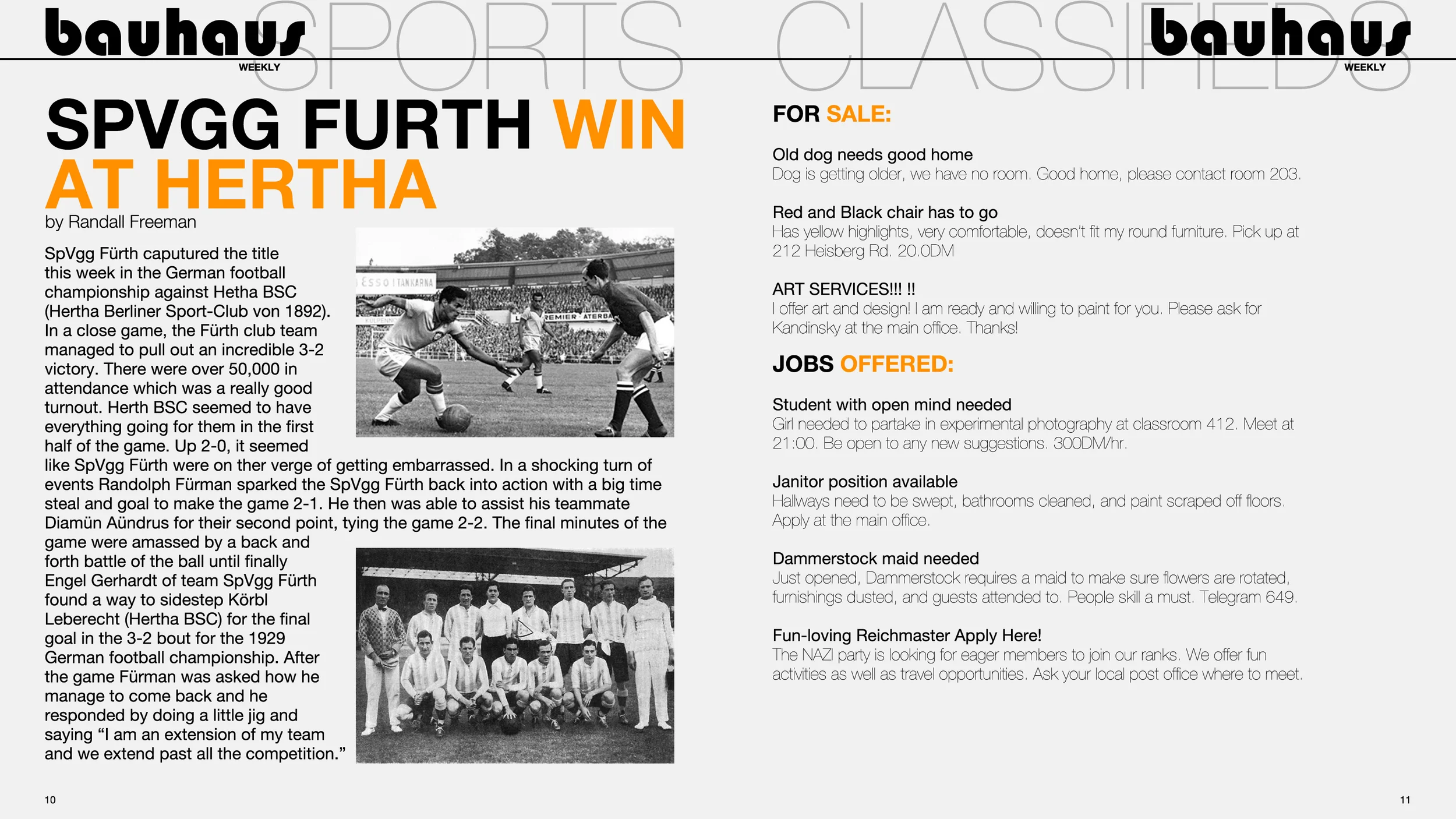 This project, worked on by myself, Sam Al Harmanneh, Randall Freeman, and Andy Merrell, was for our History of Graphic Design class. We were tasked with a subject and writing a newspaper including a News, Arts, Entertainment, Lifestyles, Sports, and Classified sections in period. We were given "Bauhaus" and chose 1929 as a base year. We then reported on stories that we found from around or during that time. While most went with the standard Newsprint articles, I wanted to do something more akin to an insert, like Parade. The sizes are in fact the same as a Parade insert. I designed and laid out all of the graphics and articles found here. The others helped by writing the articles.