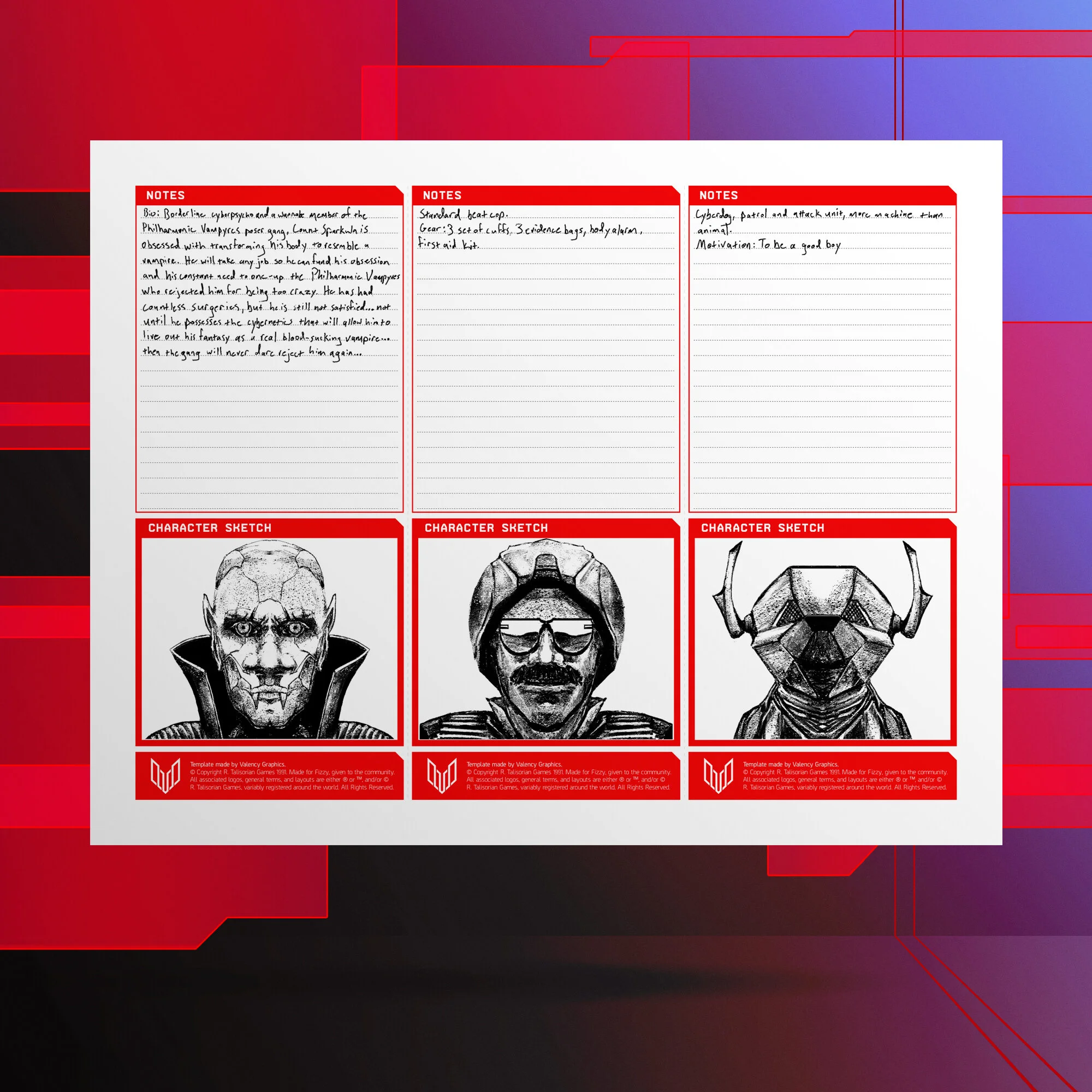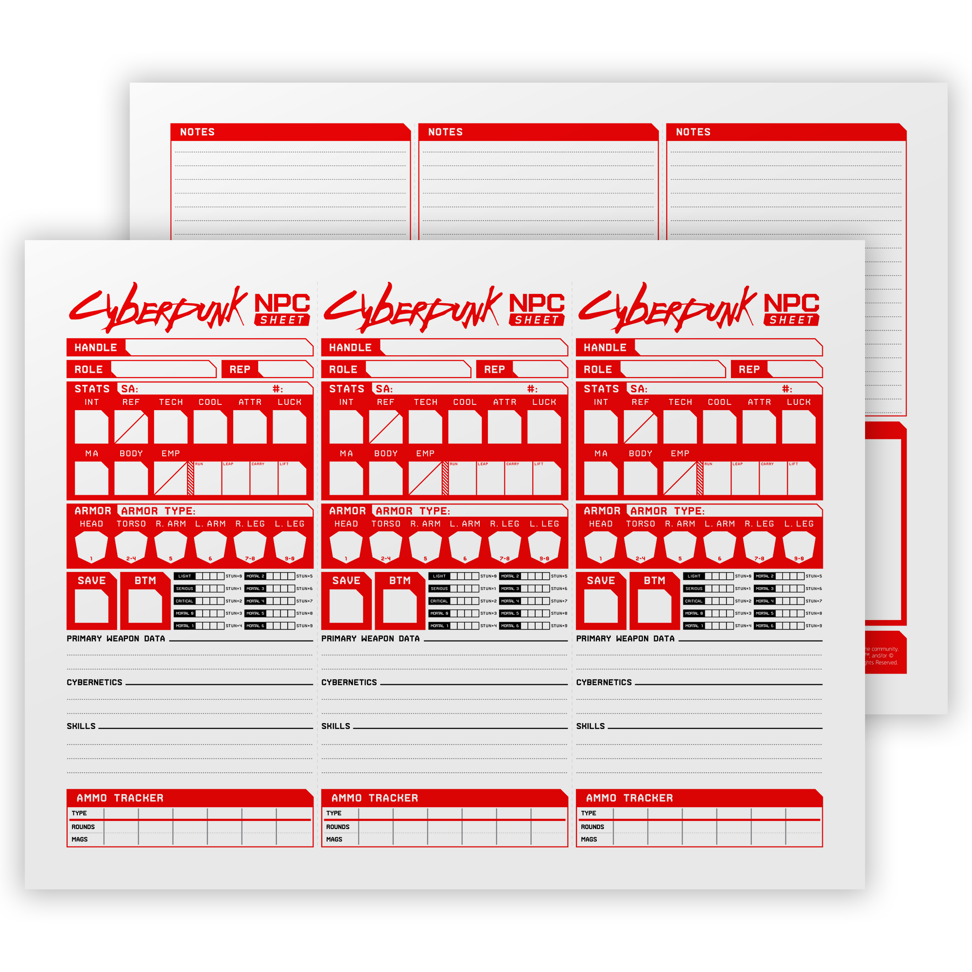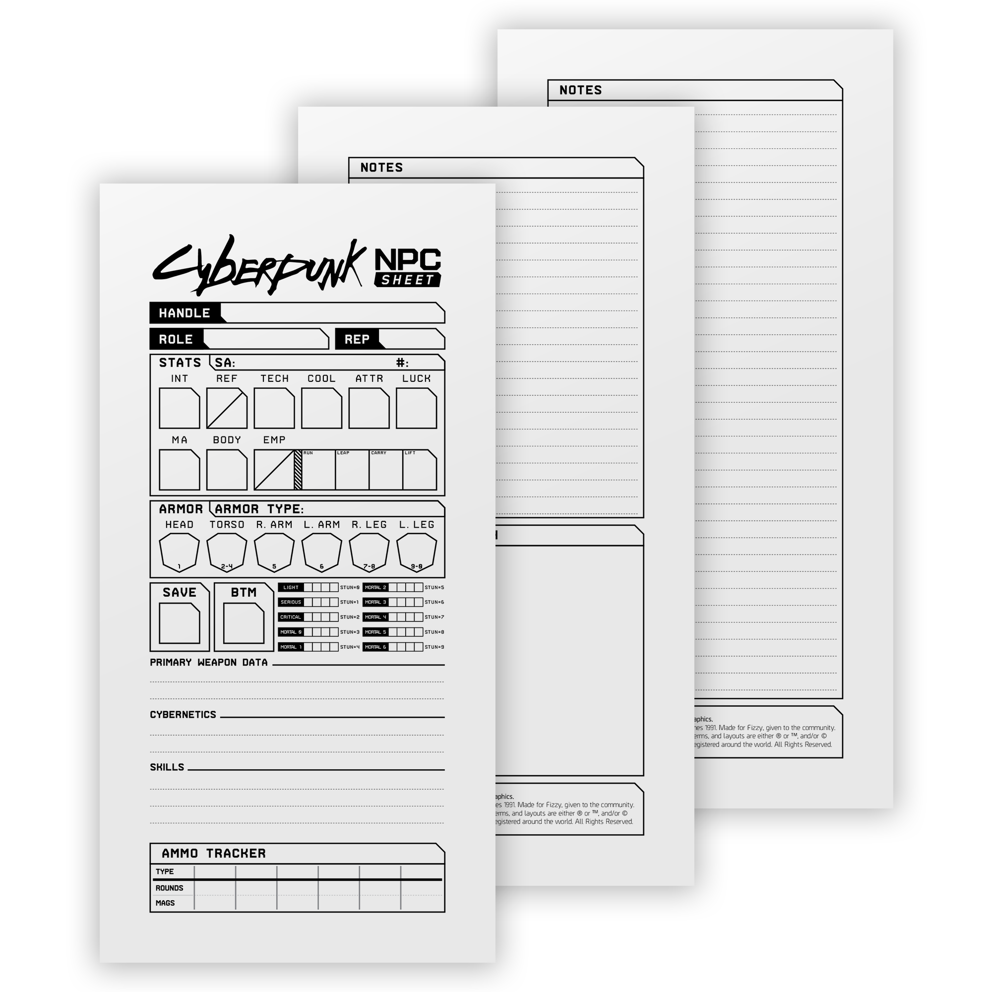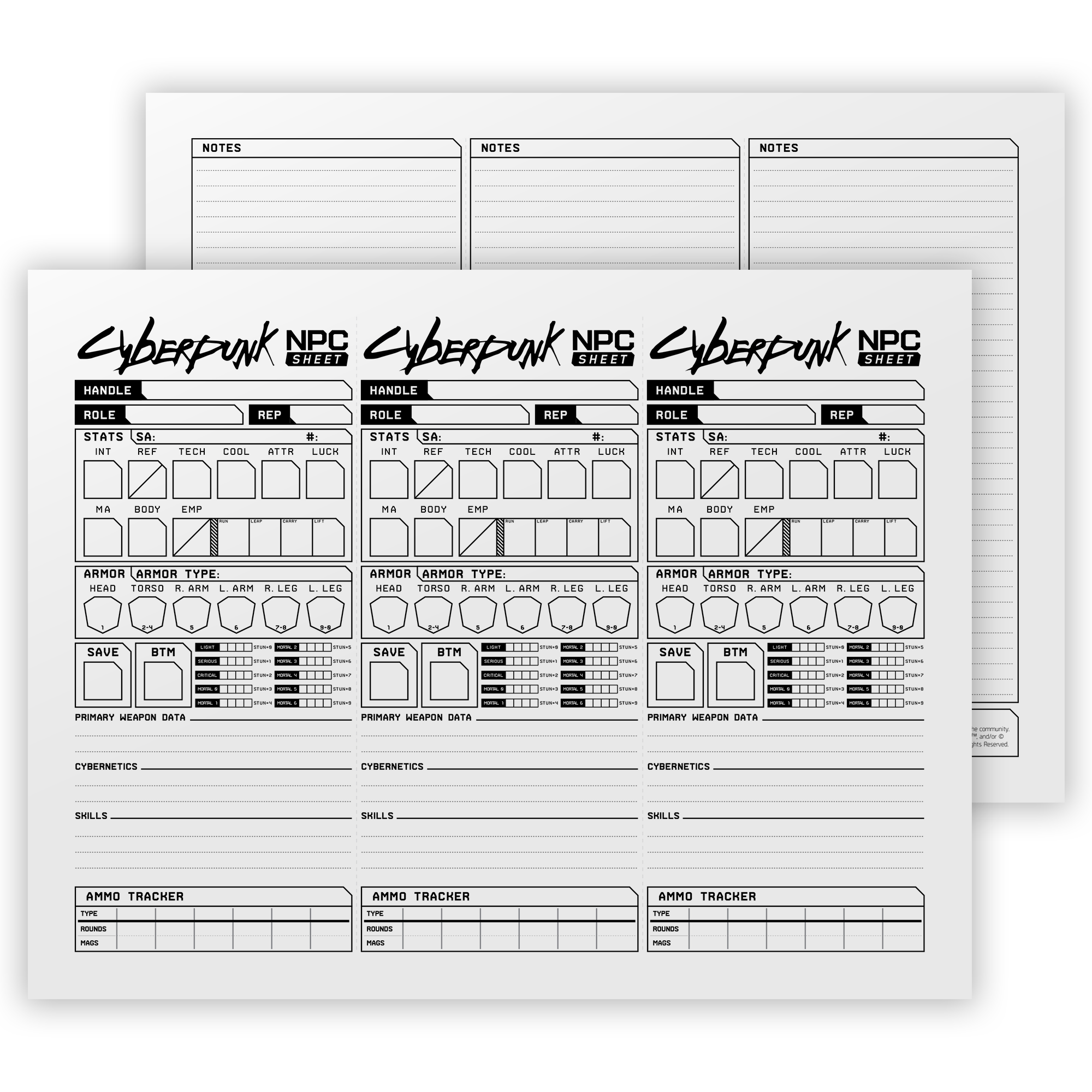 These are all-new Cyberpunk NPC Sheets, made as a companion sheet for my original Character Sheet, found here. Each feature an easy-to-read stats & armor section, optional character sketch portion, and a new free-form ammo tracker. There are three versions available for download: Full Sheet - Notes, Full Sheet - Notes + Character Sketch, and Single Sheets. All are also available in black and white for a more printer-friendly option.
