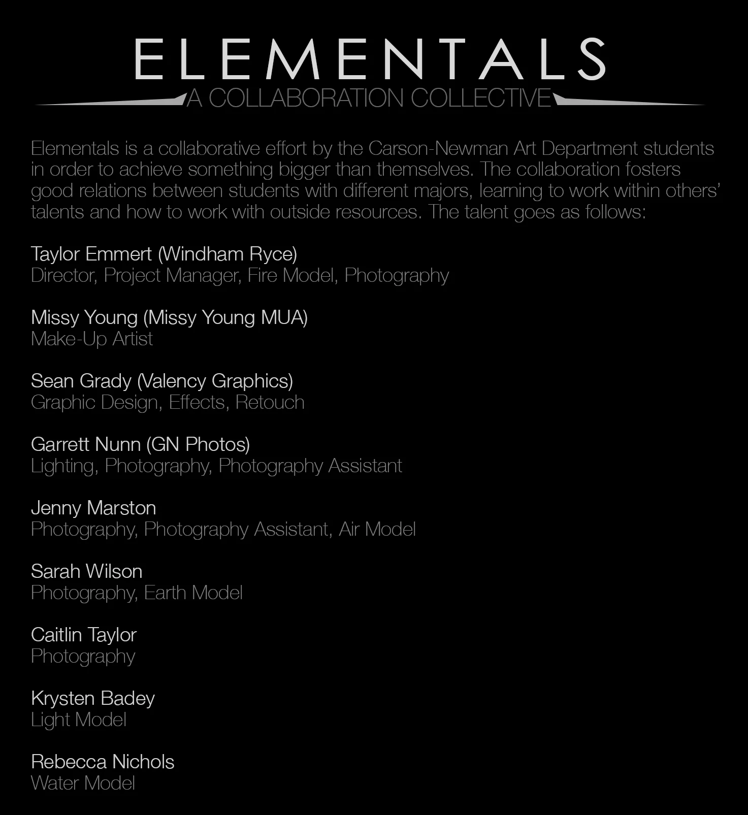 This project was a collaboration between several students at the Carson-Newman Art Department and myself as well as MUA Missy Young. This was so much fun to work on. A very unique look at the five elements that make up our world.